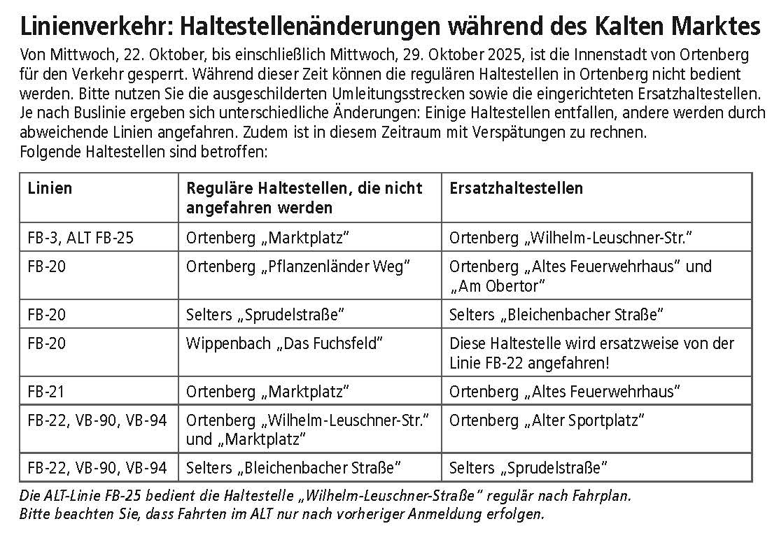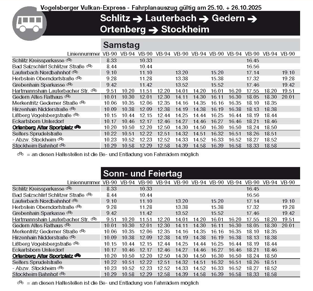Für weitere Verbindungen (z. B. aus Richtung Stockheim, Bahnhof Stockheim, Effolderbach, Selters, etc.) stehen Ihnen die Linienbusse über die Fahrplanauskunft des RMV zur Verfügung.