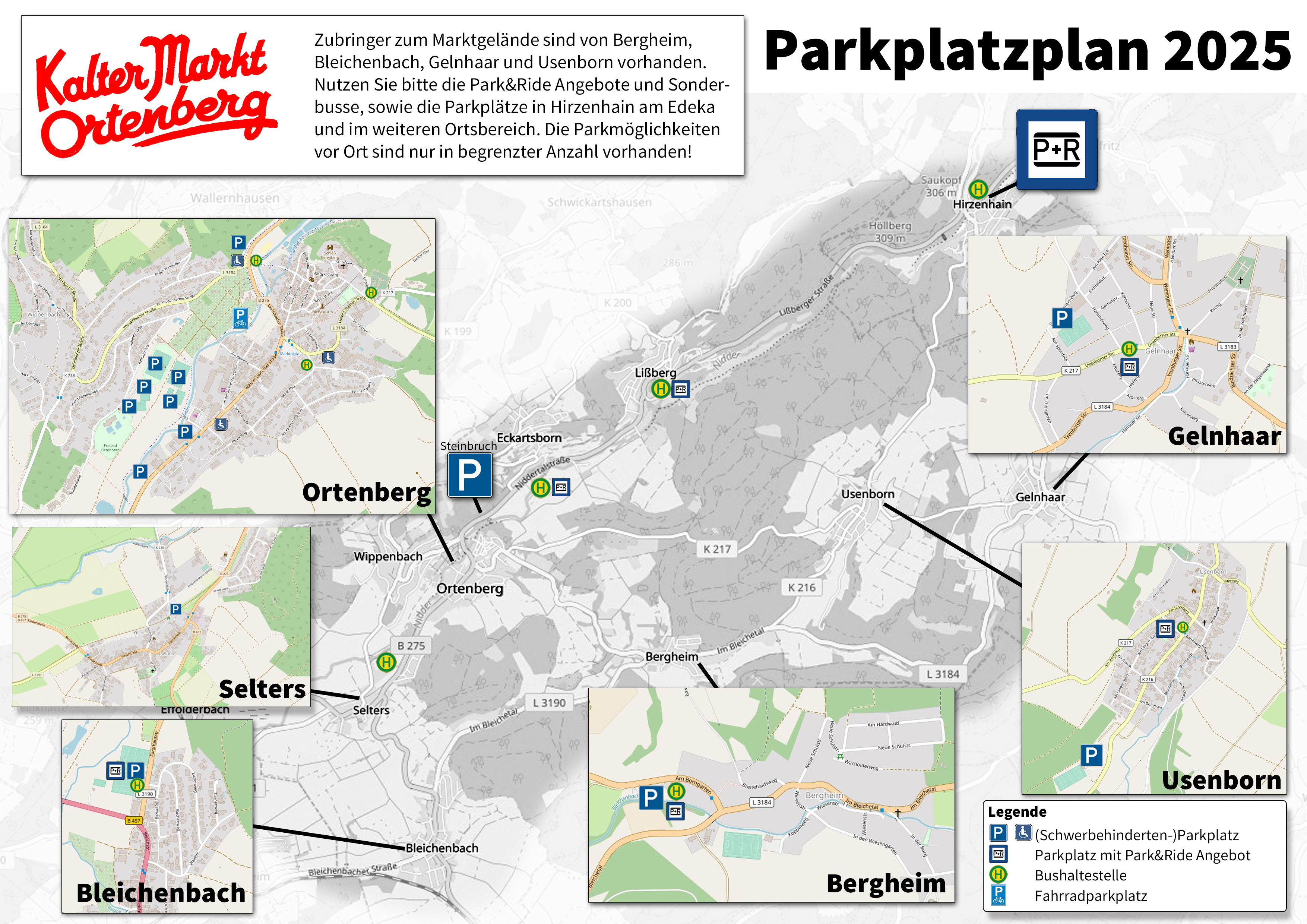 Parkplatzübersichtsplan mit Parkplätzen rund um Ortenberg und Park&Ride Angeboten 2025 |